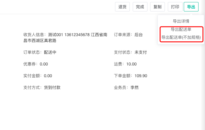 菜東家本著客戶至上的理念,始終堅持以客戶需求為導(dǎo)向,不斷創(chuàng)新研發(fā)出更符合生鮮配送企業(yè)使用的系統(tǒng)功能。 - 01 -導(dǎo)出配送單 1.查看訂單增加“導(dǎo)出配送單”功能,系統(tǒng)會按照設(shè)定的打印模板格式導(dǎo)出配送 -
