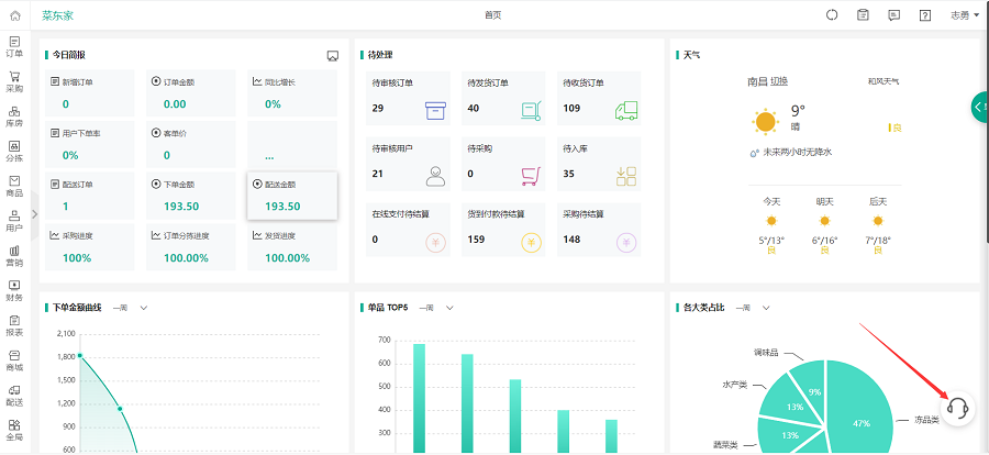 菜東家生鮮配送系統(tǒng)新功能來襲! 系統(tǒng)后臺新增售后服務(wù)功能,不論您遇到任何問題, 都有一對一的專業(yè)實施工程師為你解答,免除您系統(tǒng)使用的后顧之憂,工作更高效! 具體使用方法如下: 1.登陸系統(tǒng)后臺,鼠標 -