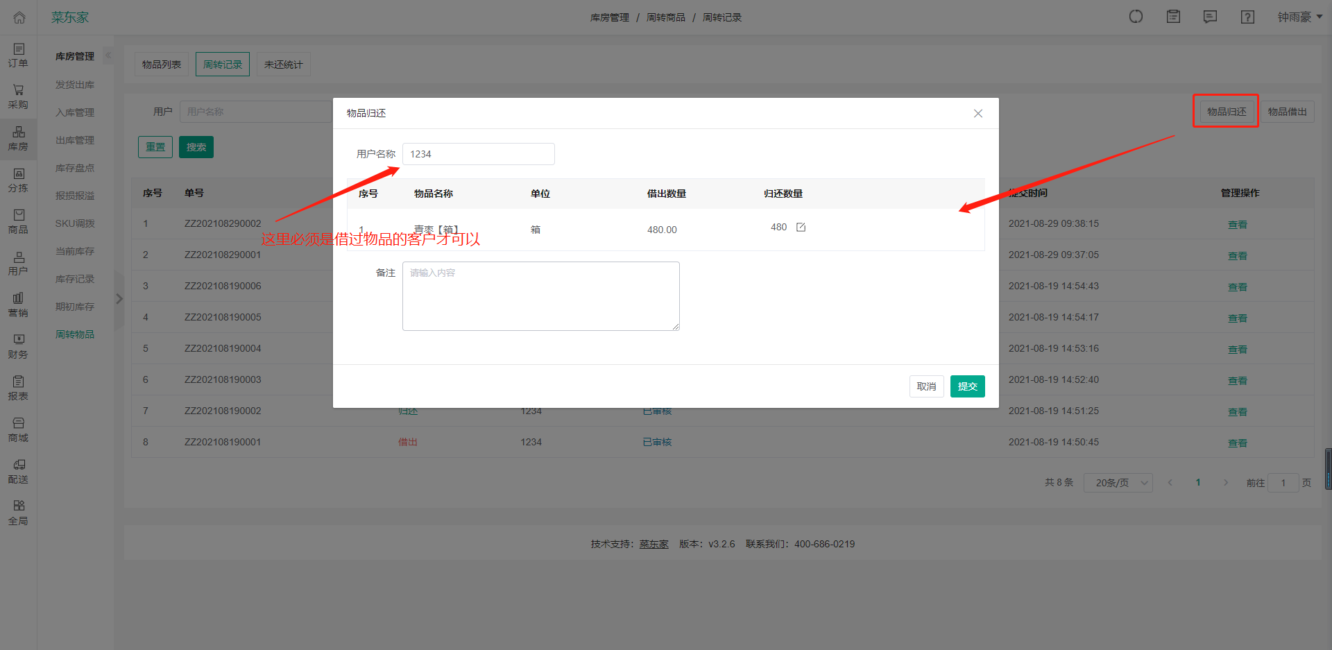 6、這里可以查看未還物品的客戶(hù)并且可以導(dǎo)出