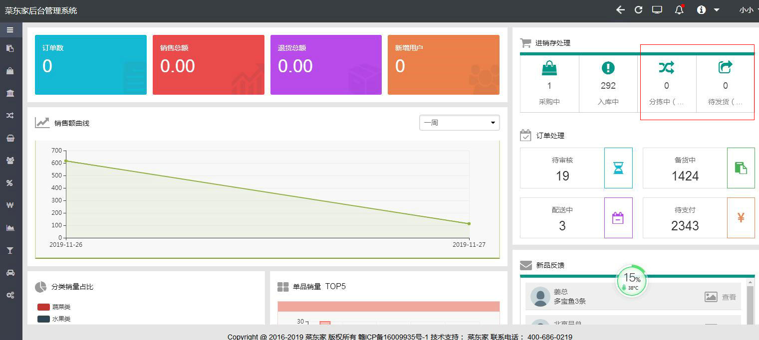 1、為了便于管理者更好地通過(guò)軟件了解、掌握經(jīng)營(yíng)情況,對(duì)系統(tǒng)后臺(tái)首頁(yè)的展示頁(yè)面,對(duì)經(jīng)銷存處理項(xiàng)下,進(jìn)行調(diào)整,修改為“分揀中、待發(fā)貨”,可以查看到當(dāng)天分揀實(shí)情,待發(fā)貨的變化情況。