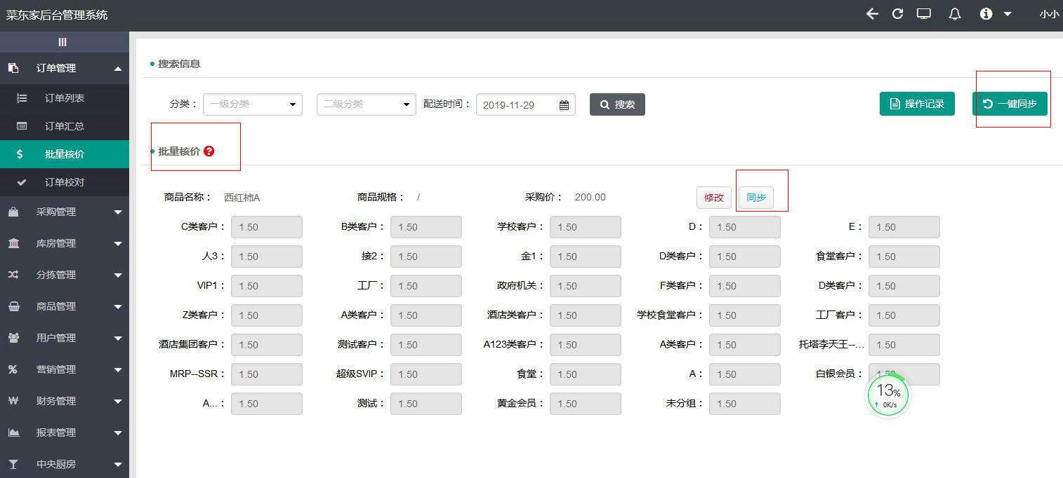 2、為了使每天菜品價(jià)格貼近市場(chǎng)的真實(shí),在訂單管理系統(tǒng)的“批量核價(jià)”功能項(xiàng)中新增“一鍵同步”。 即:每次核價(jià)完成后,當(dāng)前配送時(shí)間下的訂單商品價(jià)格會(huì)自動(dòng)改變,商品也會(huì)自動(dòng)加上或改變報(bào)價(jià)公式;當(dāng)要修改的目標(biāo)值與框內(nèi)的值相同時(shí),系統(tǒng)不會(huì)自行執(zhí)行操作, 如果確認(rèn)無(wú)誤目標(biāo)值與框內(nèi)的值一樣時(shí),就點(diǎn)擊“同步”按鈕即為核實(shí);如果有出入,就點(diǎn)擊“修改”處理。
