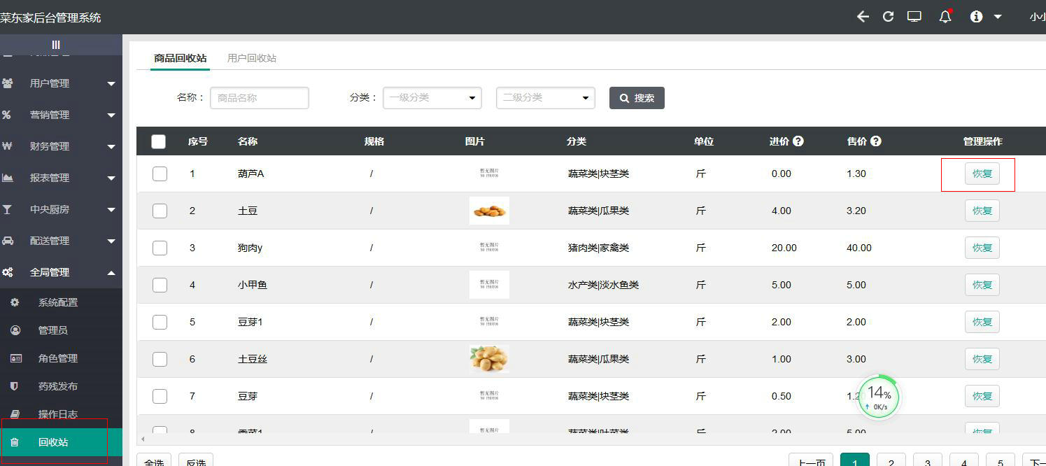 5、季節(jié)性商品,為了適配季節(jié)產(chǎn)品有無(wú)的變化,在系統(tǒng)后臺(tái)的商品管理,對(duì)商品列表中的商品,同規(guī)格的商品可做刪除處理,不會(huì)完全清處,而刪除后的本規(guī)格商品進(jìn)入回收站,等需要時(shí)可恢復(fù)。